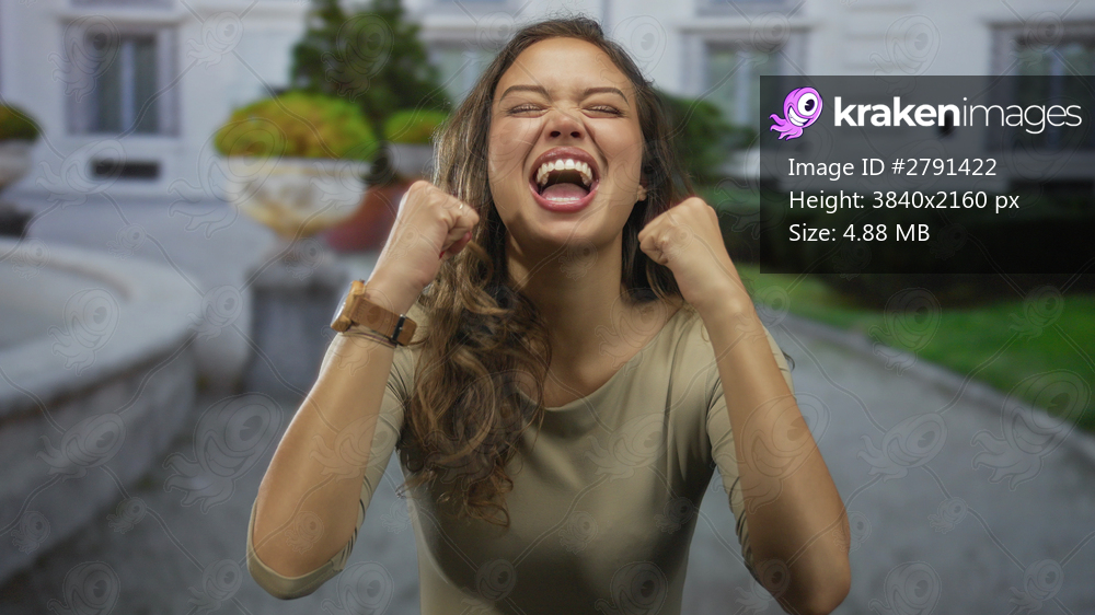 Hispanic woman celebrating outdoors on a street, showing excitement and joy, with a background of greenery and architecture, capturing a moment of youthful exuberance. - Kraken Images