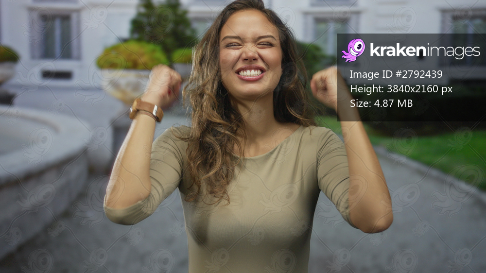 Hispanic woman celebrating outdoors on a street, showing excitement and joy, with a background of greenery and architecture, capturing a moment of youthful exuberance. - Kraken Images