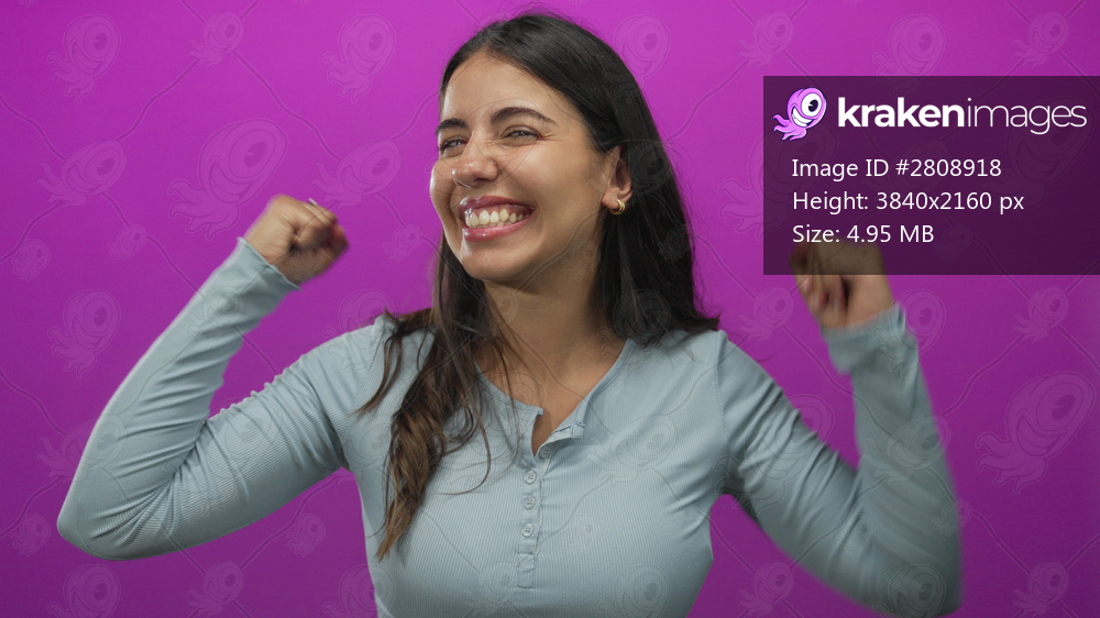 Hispanic woman celebrating with raised arms and a joyful expression against an isolated pink background wall showcasing happiness and success.