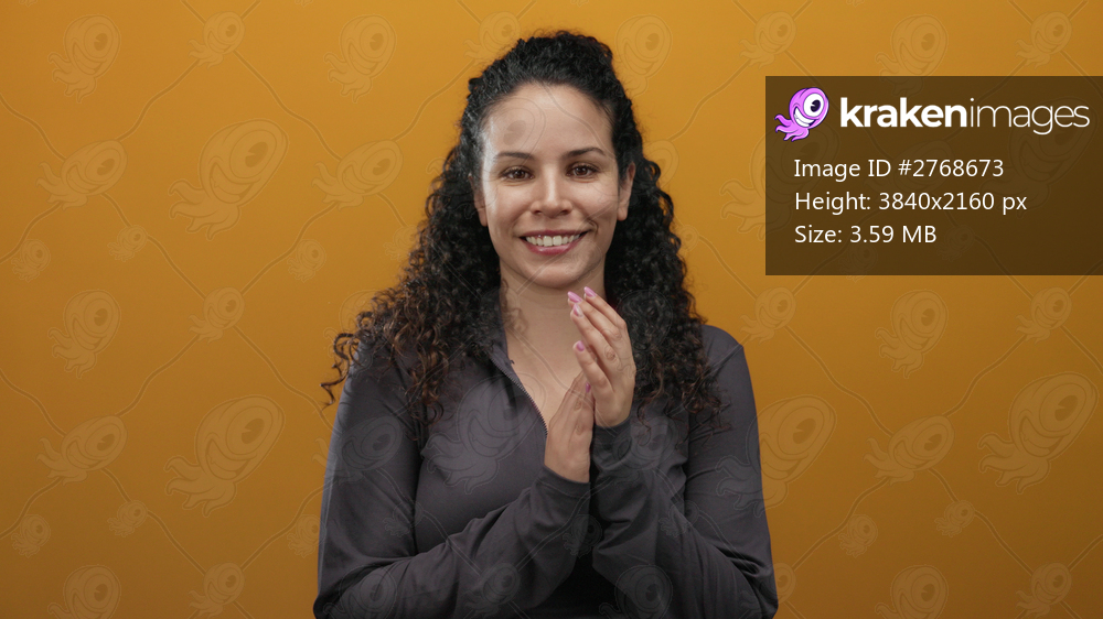 Hispanic woman clapping against a vibrant orange background, radiating a cheerful and positive expression.