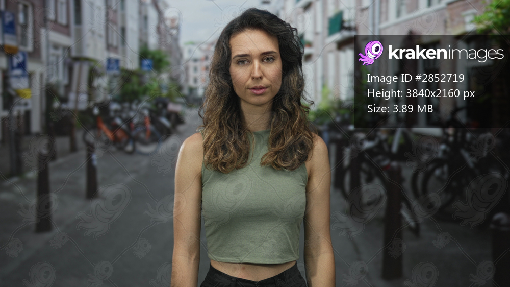 Hispanic woman with closed eyes standing on crowded city street next to brick buildings and parked bicycles; stress.