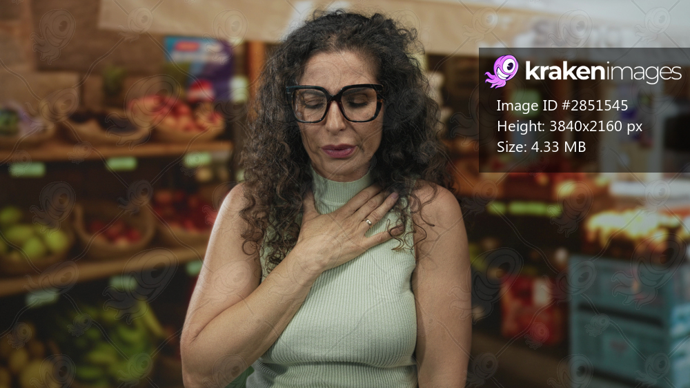 Hispanic woman clutch chest for heartattack on street fruit stand with fresh wooden produce baskets; distress.