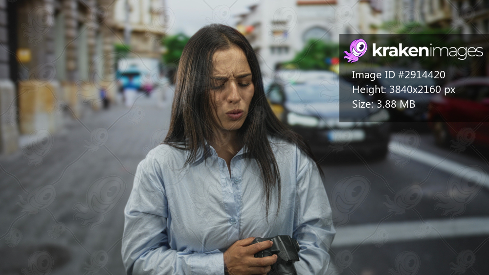 Hispanic woman clutching a camera at a crosswalk on a busy city street, wincing with a pained grimace while cars wait behind her; distress.