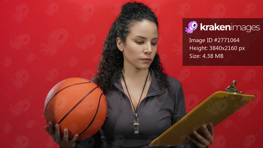 Hispanic woman coach holding a basketball and clipboard against a vibrant red wall, symbolizing sports leadership and strategy in an indoor setting.