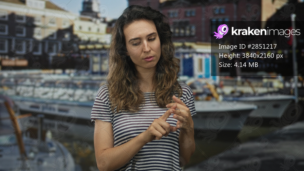 Hispanic woman counting fingers in front of building next to tied boat at dock; precision concentration.