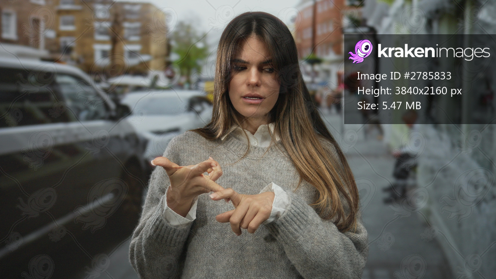 Hispanic woman counting on fingers while standing on a bustling city street with blurred urban background and autumnal setting, conveying concentration and casual style. - Kraken Images