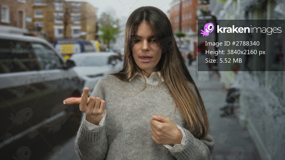 Hispanic woman counting on fingers while standing on a bustling city street with blurred urban background and autumnal setting, conveying concentration and casual style. - Kraken Images
