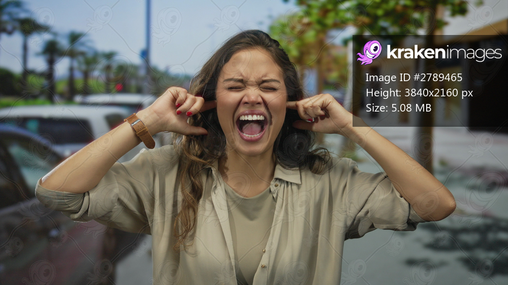 Hispanic woman covering ears in distress on a bustling urban street surrounded by parked cars and trees, expressing discomfort in a vibrant outdoor setting. - Kraken Images