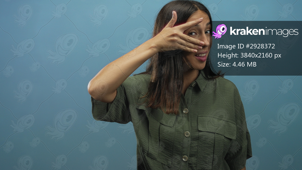 Hispanic woman covering her eyes with hand and forearm in blue studio wearing green shirt; playful curiosity.