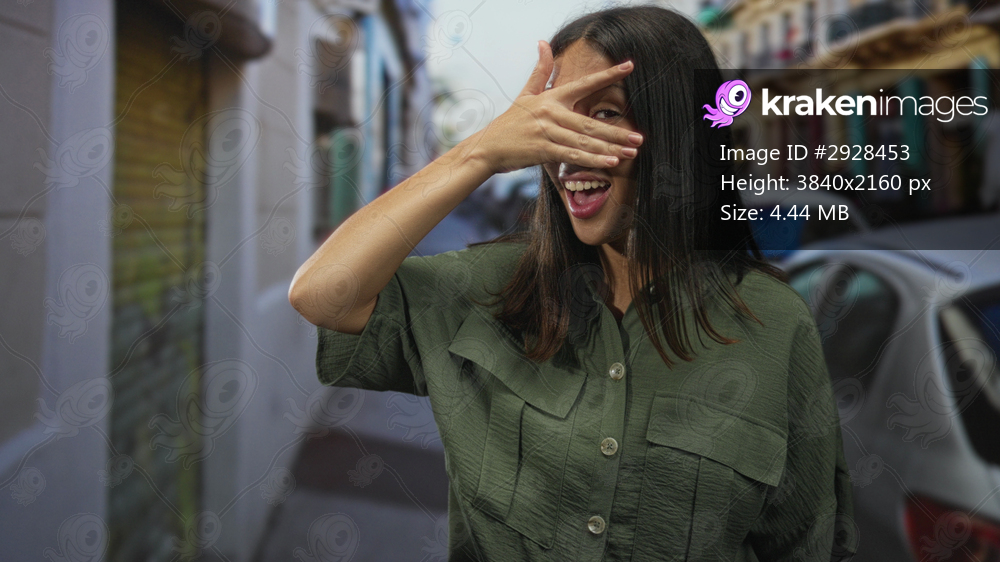 Hispanic woman covers eyes with hand on a city street while smiling beside parked cars and colorful facades; playful surprise.