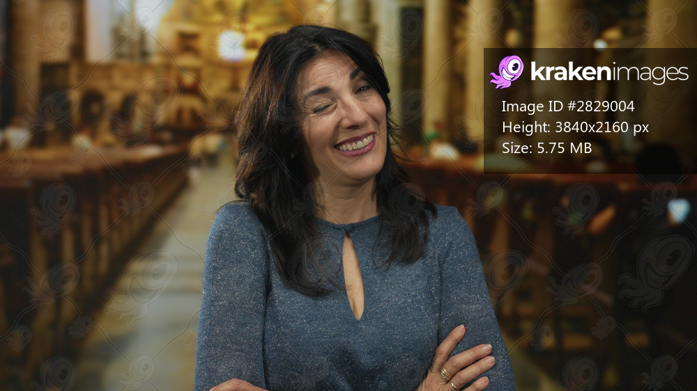Hispanic woman crossing arms inside building with blurred wooden pews and dimly lit altar behind her; faith devotion gratitude peace.