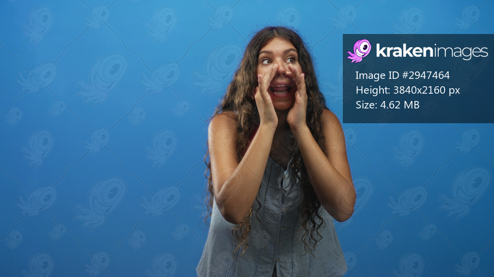 Hispanic woman cupping hands around mouth shouting in studio against blue backdrop, wearing denim blouse and long curly hair for expressive voice projection; joy urgency. - Kraken Images