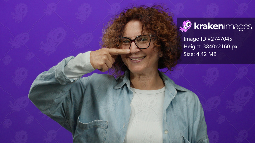 Hispanic woman with curly brunette hair and glasses pointing at her nose with a playful smile in front of a vibrant purple isolated background.