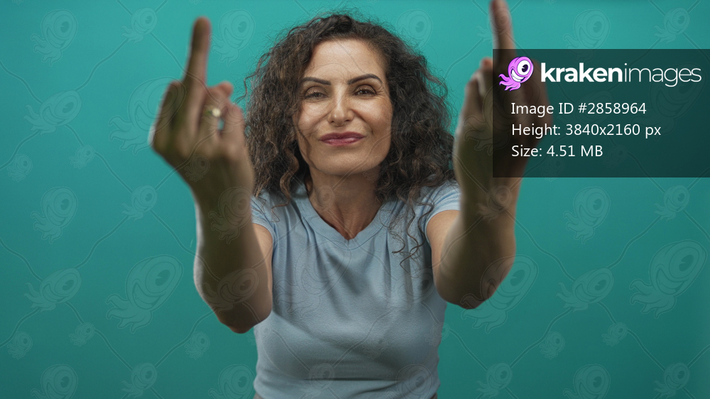 Hispanic woman with curly hair and blue t shirt extends middle fingers in teal studio environment; defiance.
