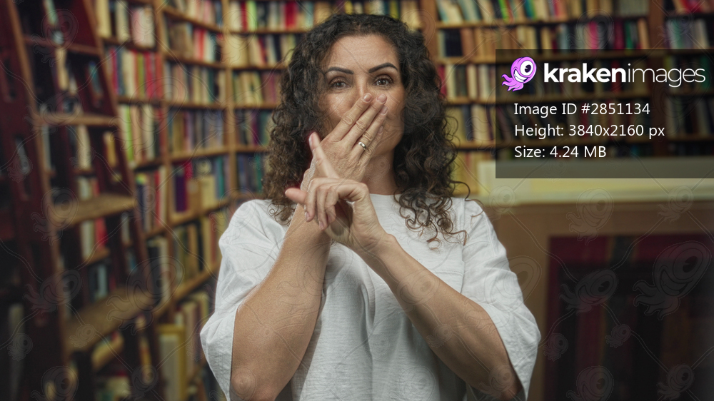 Hispanic woman with curly hair covers mouth with both hands among library shelves in building; silence.