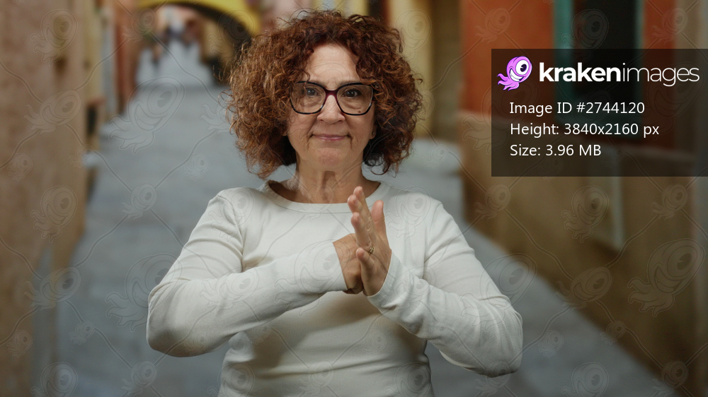 Hispanic woman with curly hair and eyeglasses, standing on a city street, makes a playful gesture with her fists, expressing humor and confidence in an outdoor urban setting. - Kraken Images