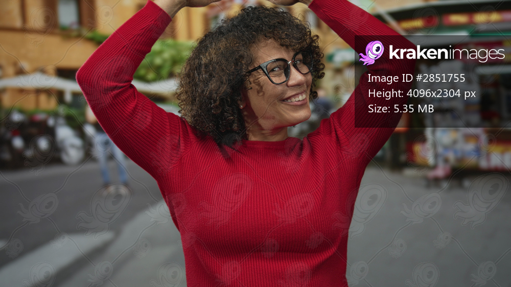 Hispanic woman with curly hair and glasses in red sweater raises arms overhead on street; celebration joy.