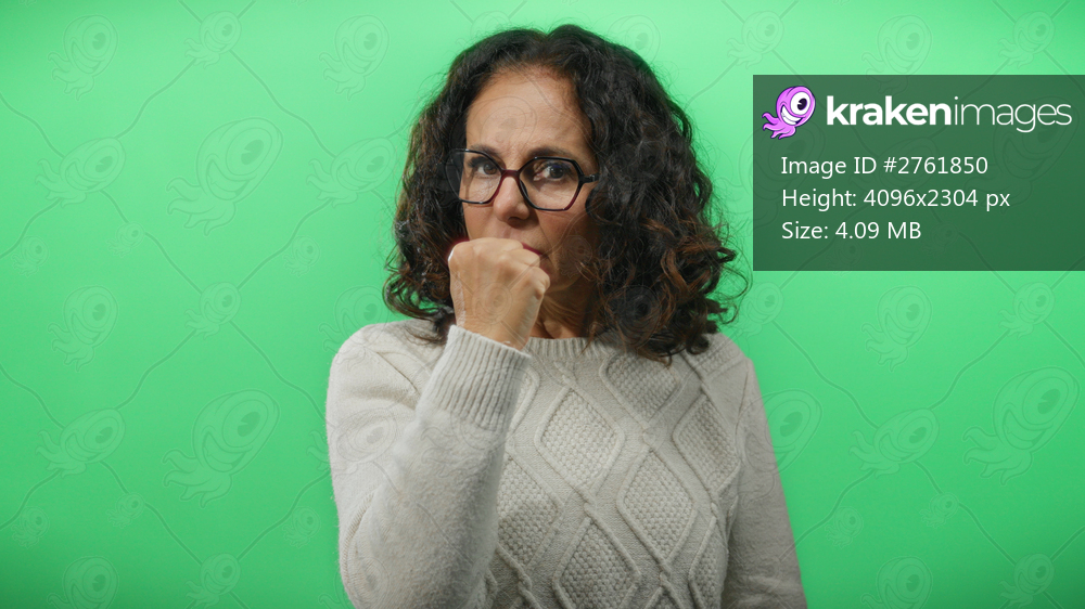 Hispanic woman with curly hair and glasses showing an angry expression with a fist against a green background.