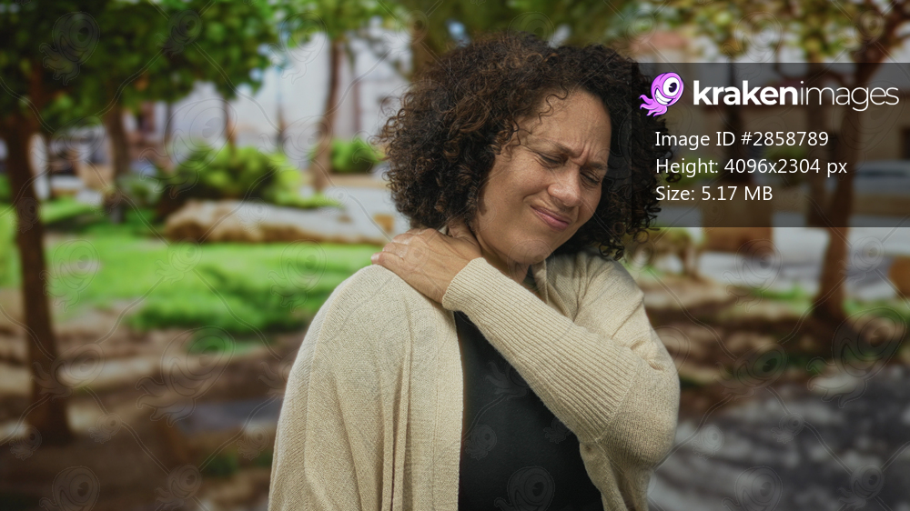 Hispanic woman with curly hair hand on shoulder for pain near shaded trees in green park setting; discomfort.