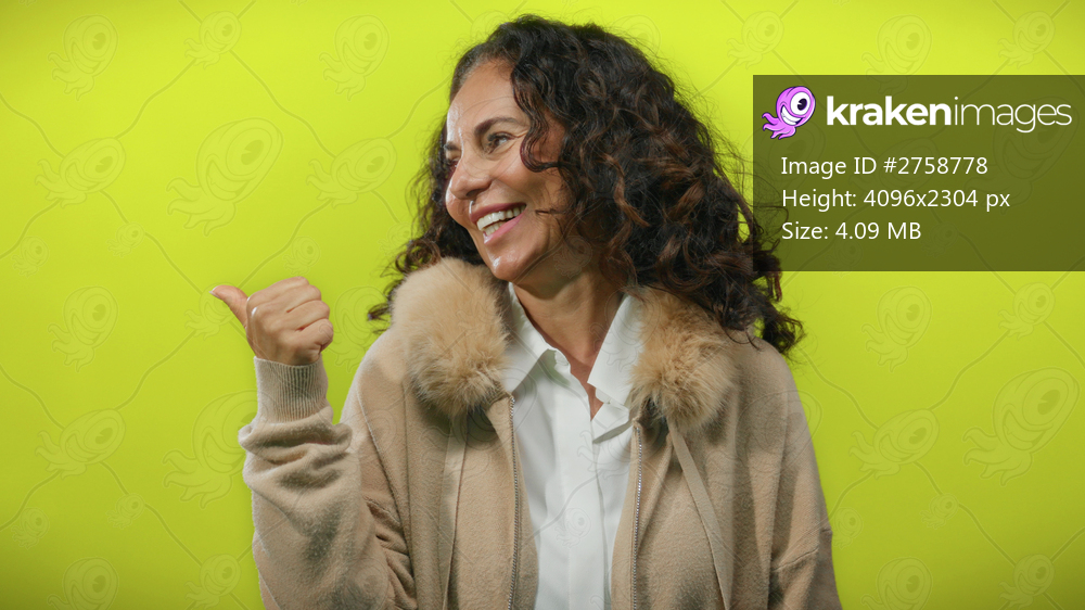 Hispanic woman with curly hair in a coat smiling and pointing sideways against vibrant yellow background.