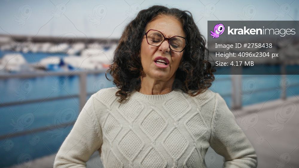 Hispanic woman with curly hair shows discomfort by the seaside with boats in the background, wearing a sweater outdoors suggesting a stomach ache or unease. - Kraken Images