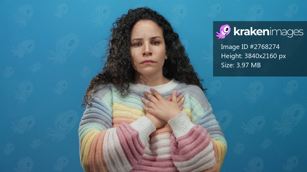 Hispanic woman with curly hair wearing a colorful sweater stands thoughtfully against an isolated blue background, conveying a sense of emotion and introspection. - Kraken Images