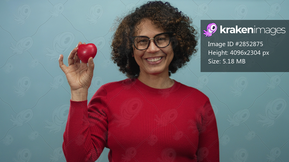 Hispanic woman with curly hair wearing glasses holds red heart close to face with a smile in blue studio; love joy.