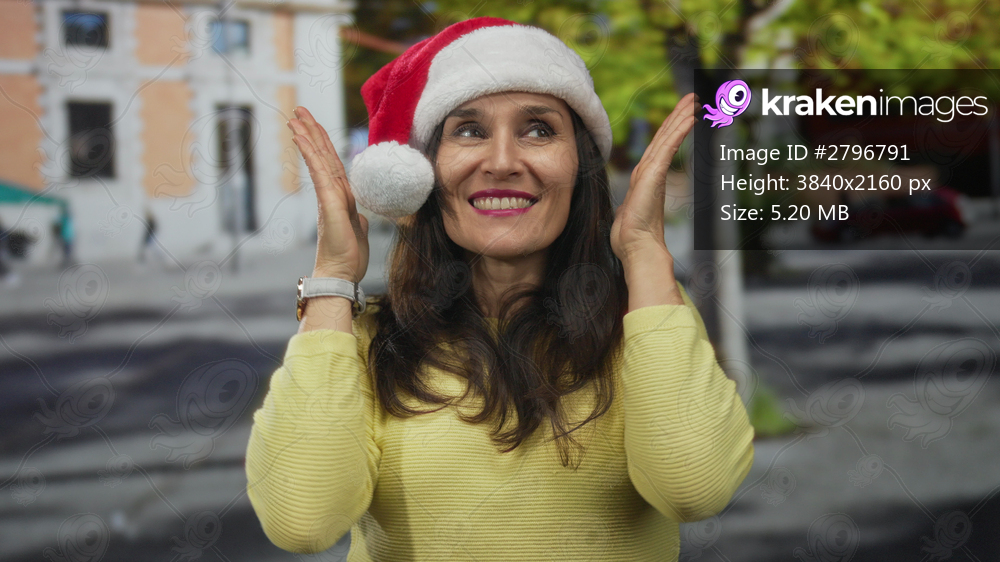 Hispanic woman with dark hair adjusts red and white santa hat with both hands on busy city street; holiday cheer.