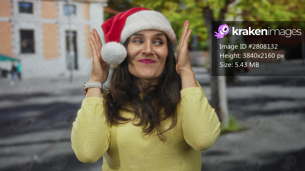Hispanic woman with dark hair adjusts red and white santa hat with both hands on busy city street; holiday cheer.