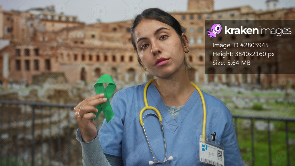 Hispanic woman doctor with a stethoscope and green ribbon stands in roman ruins, showcasing medical awareness against ancient architectural backdrop outdoors. - Kraken Images