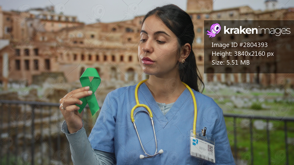 Hispanic woman doctor with a stethoscope and green ribbon stands in roman ruins, showcasing medical awareness against ancient architectural backdrop outdoors. - Kraken Images