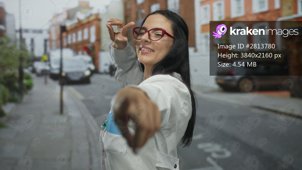 Hispanic woman doctor with glasses and stethoscope points at camera on urban street demonstrating medical confidence outdoors.