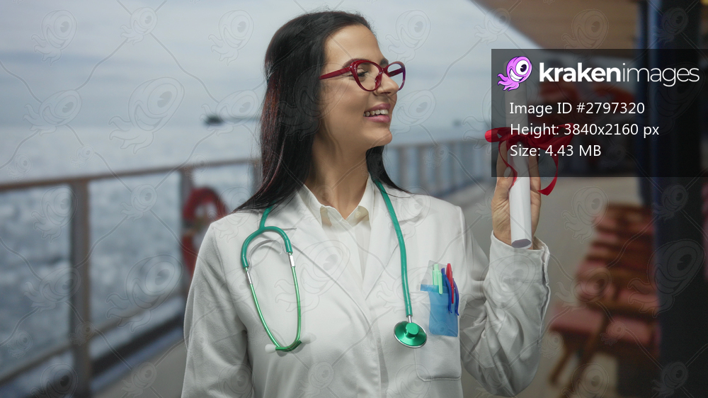 Hispanic woman doctor holding diploma on cruise ship deck with stethoscope, celebrating graduation outdoors during a voyage.