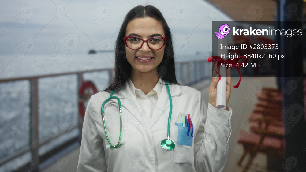 Hispanic woman doctor holding diploma on cruise ship deck with stethoscope, celebrating graduation outdoors during a voyage.