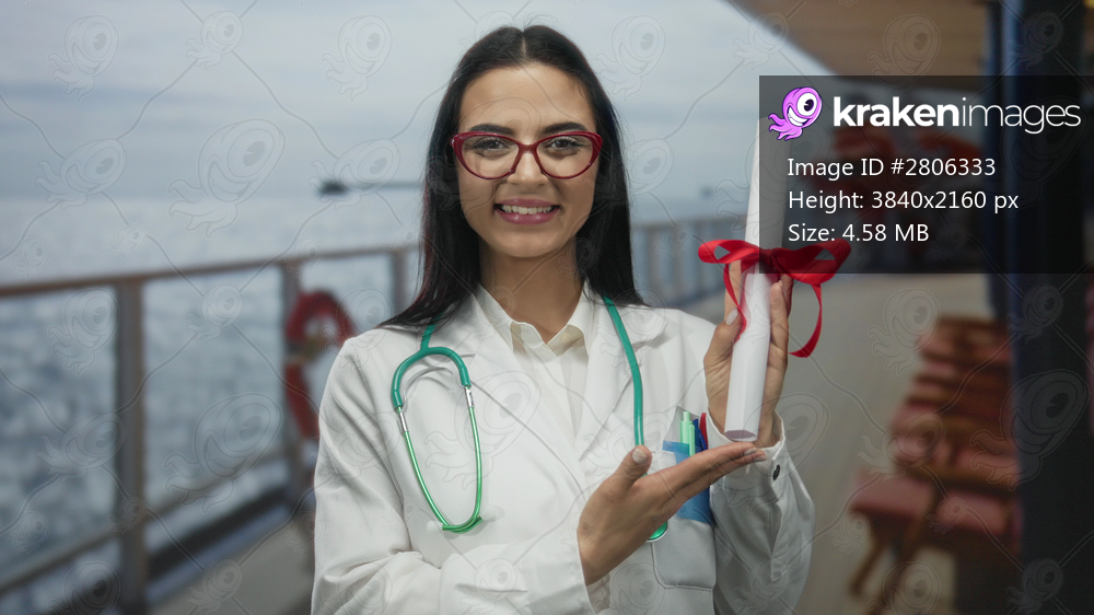 Hispanic woman doctor holding diploma on cruise ship deck with stethoscope, celebrating graduation outdoors during a voyage.
