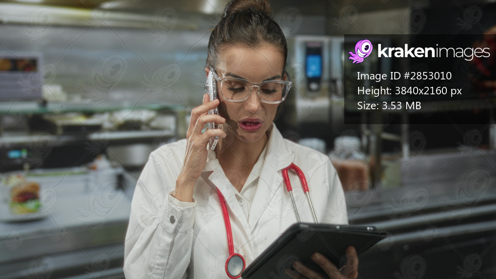 Hispanic woman doctor holds smartphone and tablet with stethoscope draped around neck in a building kitchen; dedication focus professionalism care.