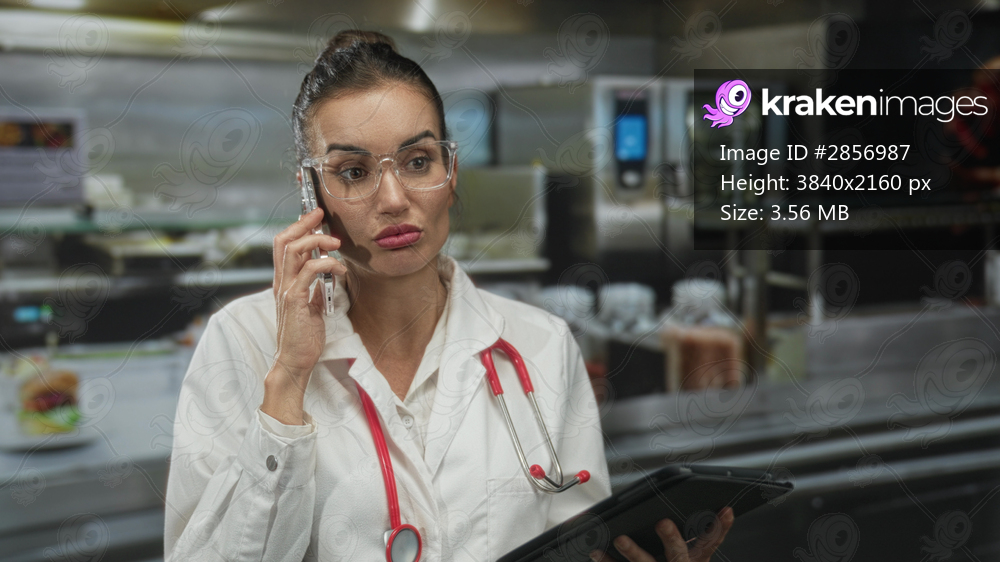 Hispanic woman doctor holds smartphone and tablet with stethoscope draped around neck in a building kitchen; dedication focus professionalism care.