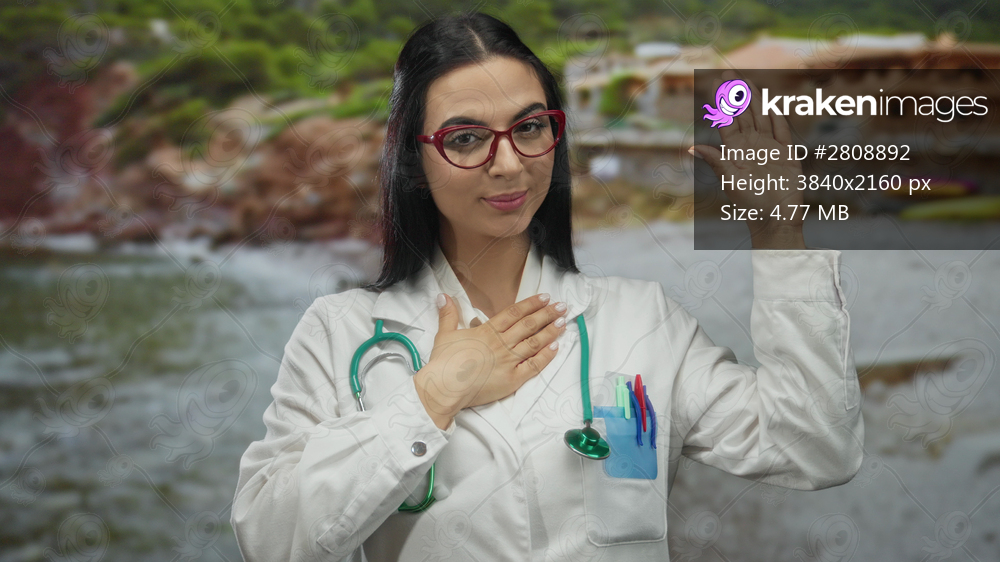Hispanic woman doctor in a white uniform with a stethoscope makes an oath gesture on a sunny beach indicating professionalism in outdoor settings.