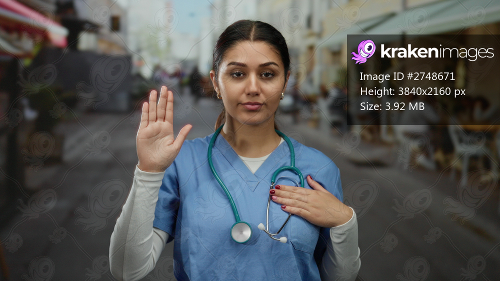 Hispanic woman doctor in blue scrubs makes oath gesture with hand on heart and other raised, standing on a bustling street, embodying professionalism and trust outdoors. - Kraken Images