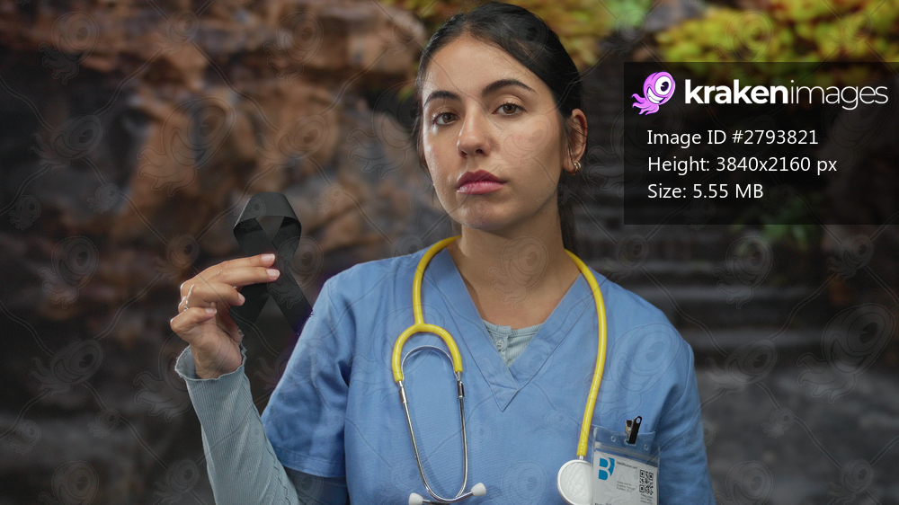 Hispanic woman doctor in blue uniform outdoors, holding black ribbon, symbolizes remembrance, serious expression, stethoscope around neck, conveying professional care. - Kraken Images