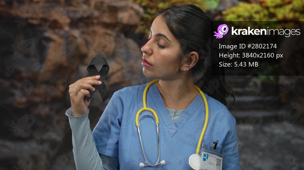 Hispanic woman doctor in blue uniform outdoors, holding black ribbon, symbolizes remembrance, serious expression, stethoscope around neck, conveying professional care. - Kraken Images