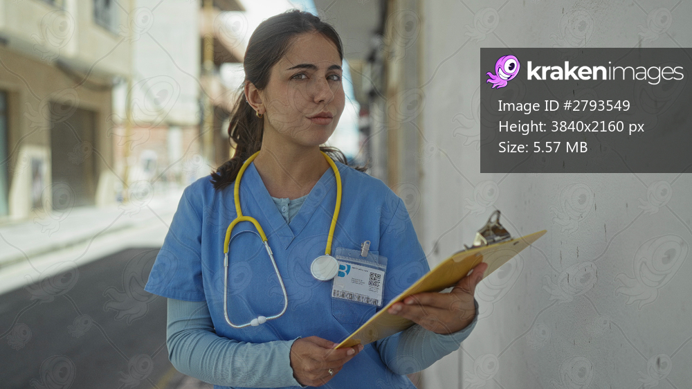 Hispanic woman doctor in blue uniform with stethoscope holds clipboard on street outdoors, embodying professionalism and care in urban healthcare setting. - Kraken Images
