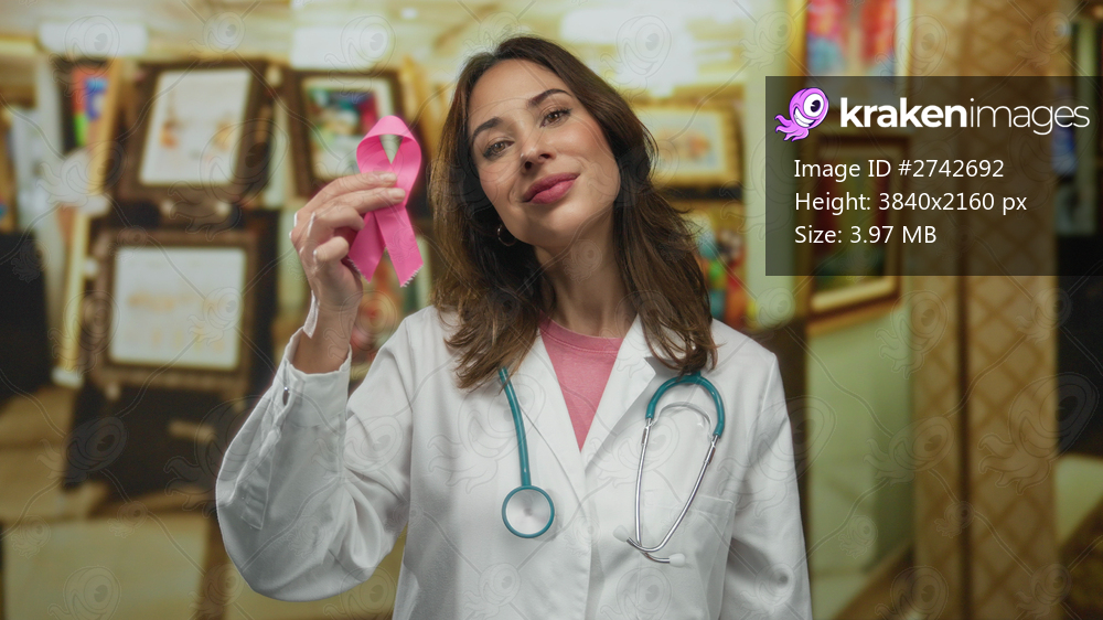 Hispanic woman doctor in gallery holding pink ribbon stethoscope art background portraying breast cancer awareness