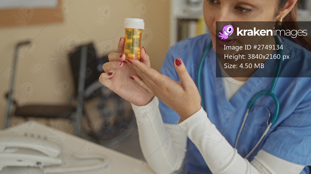 Hispanic woman doctor in hospital room holding medication bottle, wearing scrubs, examining pills with focus, stethoscope around neck, office phone in background. - Kraken Images