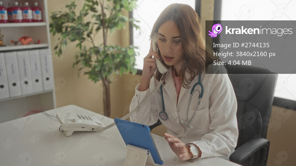 Hispanic woman doctor in hospital room with stethoscope using telephone and tablet indoors showing professional workplace environment