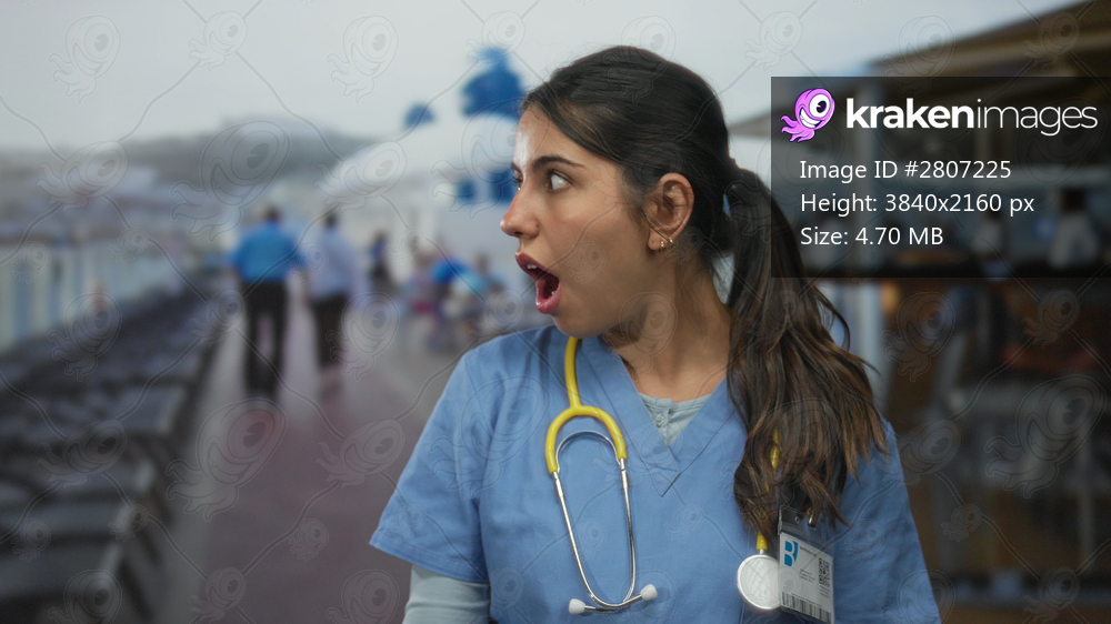Hispanic woman doctor in uniform with stethoscope expressing surprise outdoors on a boat by the seaside with blurred background.