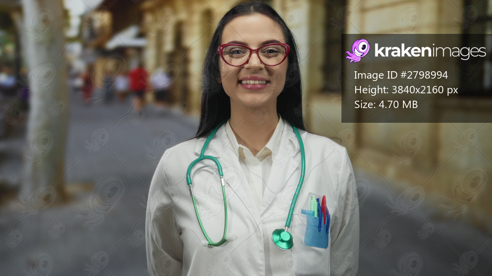 Hispanic woman doctor in uniform with stethoscope smiling confidently outdoors on a bustling city street, conveying professionalism and friendliness.