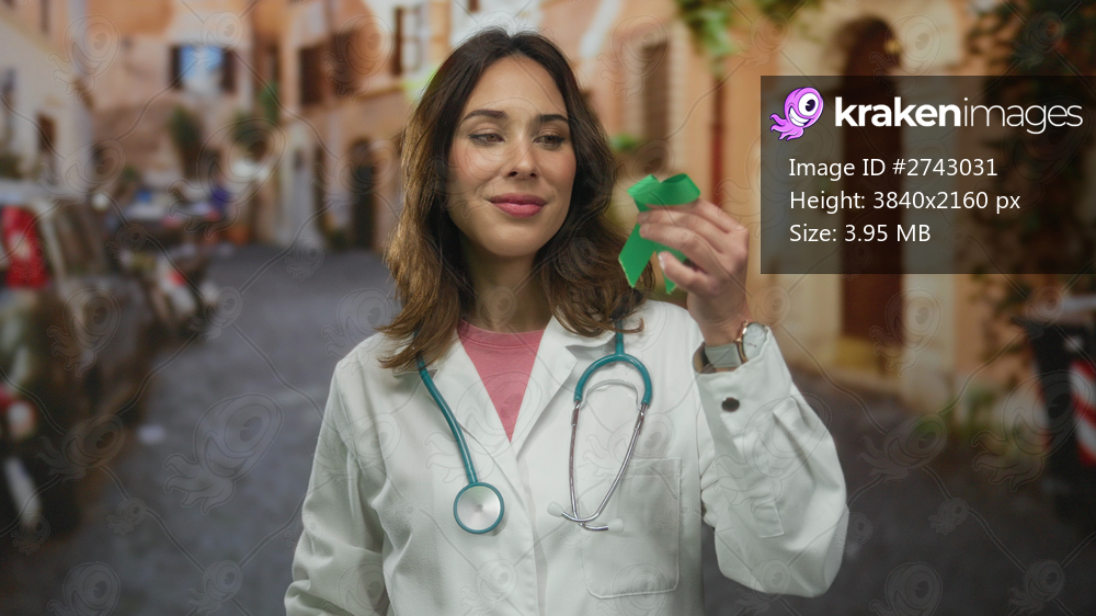 Hispanic woman doctor in white coat with stethoscope holds green ribbon outdoors on city street promoting health awareness.