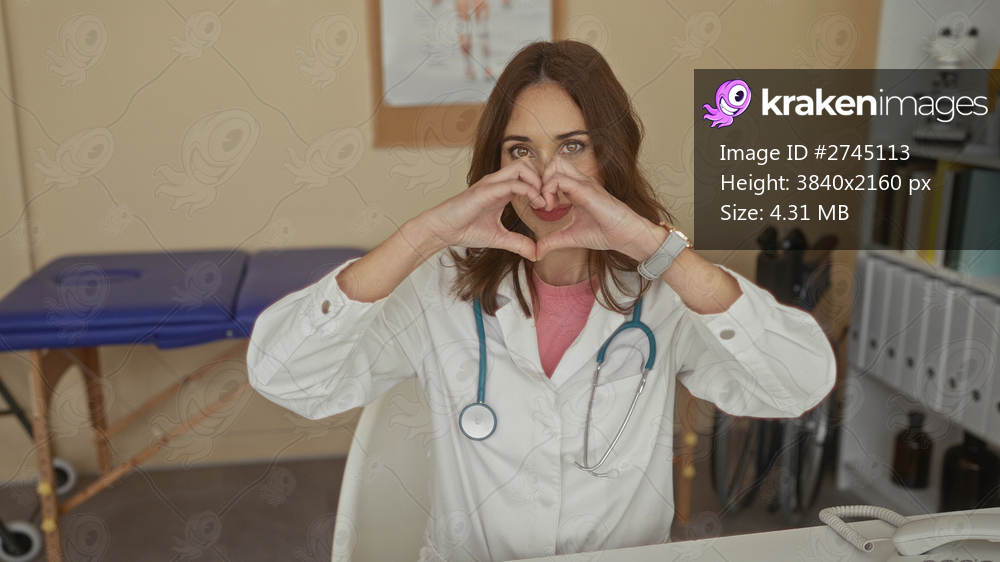 Hispanic woman doctor making heart gesture with hands in hospital room with stethoscope and medical equipment in a professional healthcare workplace