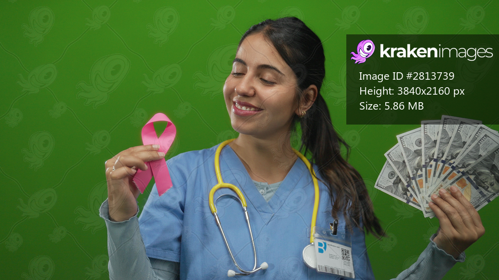 Hispanic woman doctor smiles while holding a pink ribbon and dollar banknotes against a green background, symbolizing health awareness and financial support. - Kraken Images
